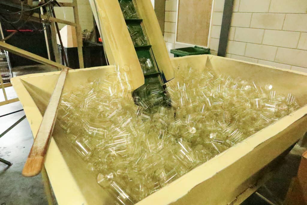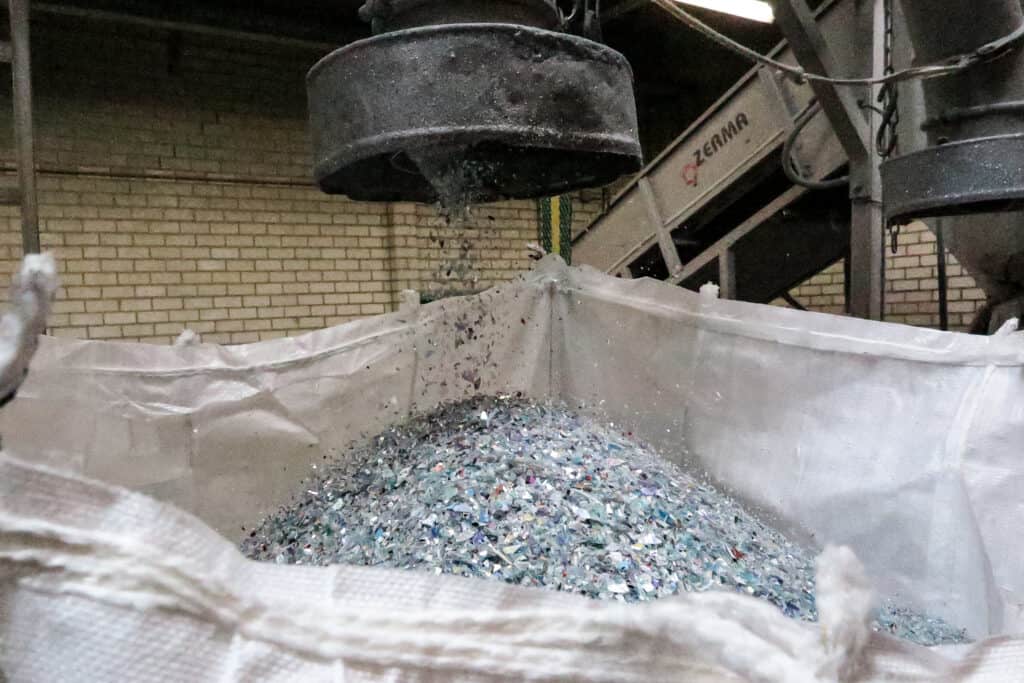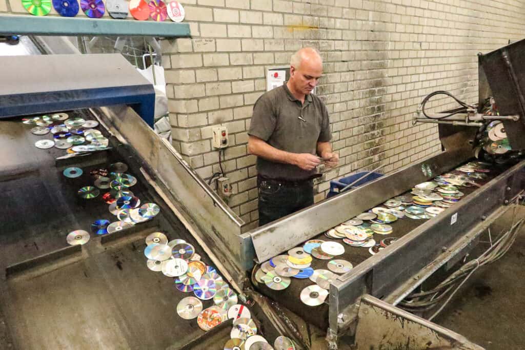 ‘We begonnen met het verwerken van de “sprues”, de uitdruksterretjes die bij de productie van cd’s in het gat in het midden van de schijfjes zitten’, vertelt Lars. ‘Dat is zuiver polycarbonaat. De cd-schijfjes kregen we er gratis bij. Anders gezegd: we moesten de schijfjes meenemen anders kregen we de sterretjes niet. Behalve de fabriek hadden we een transportbedrijf om al die tonnen schijfjes te vervoeren. Die werden in schuren in de omgeving opgeslagen tot we ze konden verwerken. Oorspronkelijk kwam al het materiaal uit Nederland en België, maar met het teruglopen van de cd- en dvd-verkoop komen de schijfjes inmiddels uit heel Europa. De cd- en dvd-schijfjes vanuit de retail en kringlopen vormen een relatief kleine stroom, maar zijn ook zeer welkom. Er is verwerkingscapaciteit genoeg.’ Op dit moment verwerkt de fabriek van MEWA ongeveer 500 tot 600 kilo schijfjes per uur, dat is een kleine 14.000 kilo per dag. Dagelijks gebruikt MEWA zo’n 3000 kilo daarvan voor de kaarsenhouders.