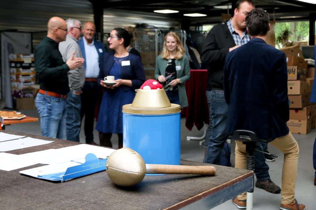 9 oktober 2019 | Met een fikse klap van een hamer op een rode knop onthulde wethouder William Dogger bij Stichting Kringloop Zwolle woensdag 9 oktober de naam WaardeRing. Hij prees de opzet van het nieuwe netwerk, waarin niet alleen de aandacht uitgaat naar hergebruik van materialen, maar waarin ook zeker het sociale aspect aanwezig is en mensen een steuntje in de rug krijgen op weg naar werk. Samen met voorzitter Gerard van Dooremolen van de stichtingen Kringloop Zwolle en Noggus&Noggus demonteerde hij op aanwijzing van leerlingen van Thorbecke Praktijkonderwijs een aantal cd’s en dvd’s. Het harde kunststof wordt verwerkt tot granulaat, waar kaarsenstandaards van worden gemaakt. Vervolgens kregen wethouder en genodigden in de kringloopwinkel een rondleiding langs projecten van mbo-studenten van Cibap, vakschool voor vormgeving, die oude artikelen in een kunstzinnige setting een nieuwe look hadden gegeven. Daarna was het tijd voor een hapje en een drankje, verzorgd door de mensen van restaurant Deksels. Het was een zeer geslaagde aftrap van WaardeRing. Op naar een circulaire toekomst!
