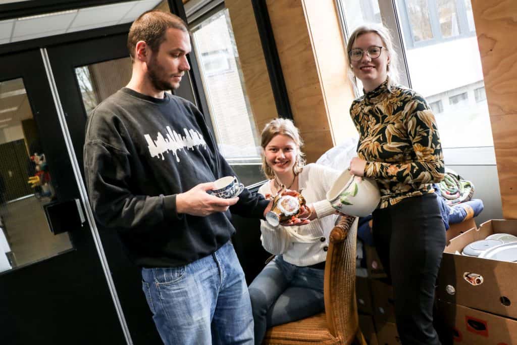 Studenten Restauratie en Decoratie Teuntje en Anouk hebben er zin in. ‘Het is een heel interessante opdracht’, zegt Teuntje. ‘Ik vind kringloop sowieso geweldig. Ik kom er vaak, om milieuredenen, maar ook om kunstzinnige redenen. Het is heel leuk om her te gebruiken. Ik denk dat ik iets met rotan en riet wil gaan doen. Misschien verpulveren, mengen met andere producten. Je moet natuurlijk wel opletten dat het proces niet te duur en te milieubelastend wordt.’ Anouk heeft nog nooit een opdracht op het gebied van hergebruik gehad. ‘Het is een hele uitdaging. Ik weet nog niet welk materiaal me het meest aanspreekt. Het is ook afhankelijk van wat de anderen in het groepje willen. We moeten eerst kennismaken, dan ontdekken wie waar goed in is, en vervolgens nog even uitvinden wie wat wil gaan doen. Maar dat gaat vast lukken.’