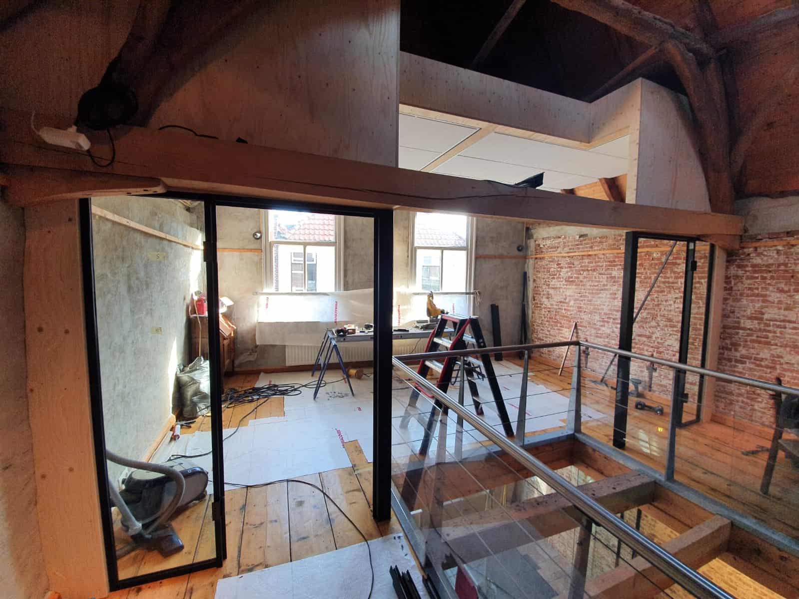 ‘Ik steek heel veel op van deze opdracht’, zegt Birte. ‘Zo leer ik bijvoorbeeld dat je alles goed moet plannen. Voor de productie van de grote overlegtafel bleek bijvoorbeeld veel tijd nodig te zijn, dus die moet je in de startfase al bestellen, voordat je naar de kringloop gaat. Zoiets leer je bij een project op school niet, waar we alleen ontwerpen en niet uitvoeren. In zo’n praktijkopdracht leer je ook veel over kosten en financiering. En verder heb ik gezien hoe het bedrijf Slukom heel professioneel een aantal glazen afscheidingswanden maakte, die mooi aansloten op de eeuwenoude muren die nergens recht zijn. Ze deden alles om de schoonheid van het pand zo goed mogelijk te bewaren. Dat vond ik ook leerzaam om mee te maken.’