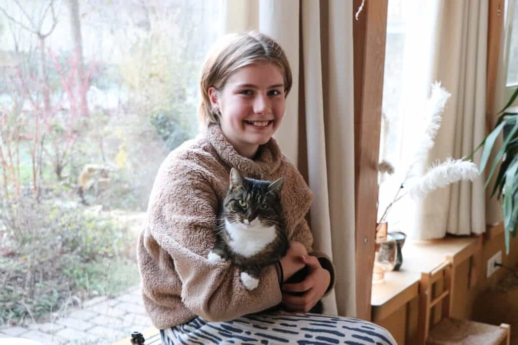 ‘Ik maak me wel eens zorgen. Wij kijken elke ochtend op school het nieuws en daar gaat het vaak over het milieu en het klimaat. Dan zie je hoeveel fabrieken en auto’s er zijn, hoeveel benzine, gas en olie er nodig is. En hoeveel er in de natuur terechtkomt. Ik denk dat het fout gaat als het zo doorgaat. Maar als meer mensen hun best doen, dan komt het misschien nog goed. Ik denk dat je er zelf heel veel aan kunt doen. Later wil ik ook wel graag in zo’n huis als dit wonen. In de wijk hiernaast, of zo. Er komen in die wijk nog allemaal nieuwe ecohuizen bij. Daar zie je ook tiny houses, die zijn heel klein! Daar past alleen maar een bed, een piepklein keukentje, een stoeltje en een tafel in. Maar ja, meer heb je eigenlijk ook niet nodig.’