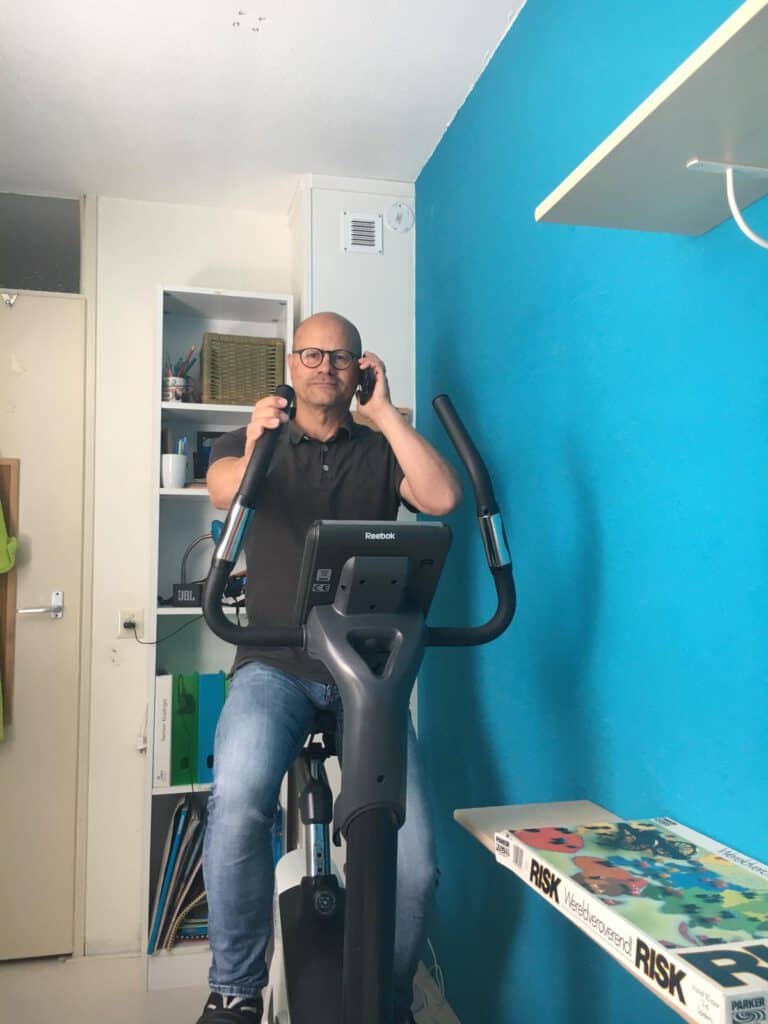 We werken zoveel mogelijk thuis, al proberen we het nu langzamerhand weer wat op te bouwen. Ik werk op een afdeling met dertig mensen, dat betekent één dag per twee weken op kantoor. Ondertussen probeer ik thuis wat in beweging te blijven: als ik bel doe ik dat zoveel mogelijk op de hometrainer. Verder spreek ik gemiddeld eenmaal per week voor overleg af bij een collega thuis, dat is ook goed te doen. Elkaar fysiek ontmoeten is toch wel een stuk prettiger dan online. Het communiceert gewoon een stuk beter, je kunt elkaar beter lezen.