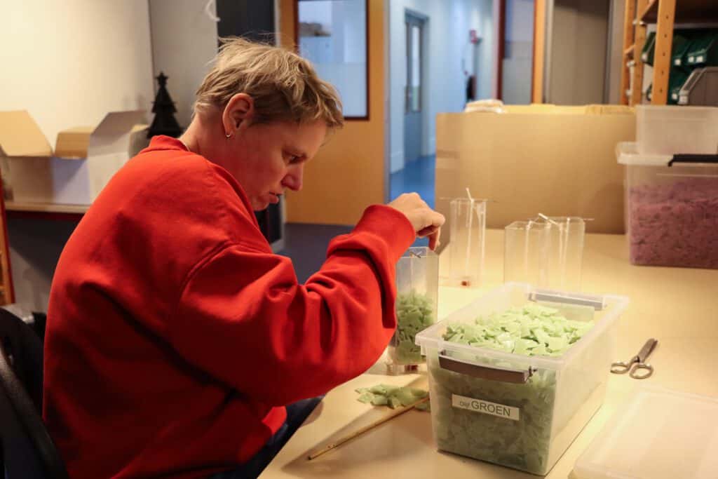 Vijf jaar geleden, in 2019, begon de kaarsenmakerij met recyclekaarsen. Het was wel een andere tak van sport. ‘Nieuwe paraffine is schoon, dat kun je meteen gebruiken’, legt coördinator Gieneke van Assen van de Kaarsenmakerij -onderdeel van Werkkracht15- uit. ‘Als wij nu een container met gebruikt kaarsvet krijgen, kan er van alles inzitten. Lange kaarsen, stompjes, hele kaarsen, kaarsen in glaswerk, geurkaarsen. Dat moet allemaal uitgezocht worden. Wij sorteren het allemaal, ook op kleur. Er gaat dus een heel lang proces aan vooraf, voordat je het weer kan gebruiken. Gelukkig vinden de deelnemers dat sorteren en schoonmaken heel leuk werk.’