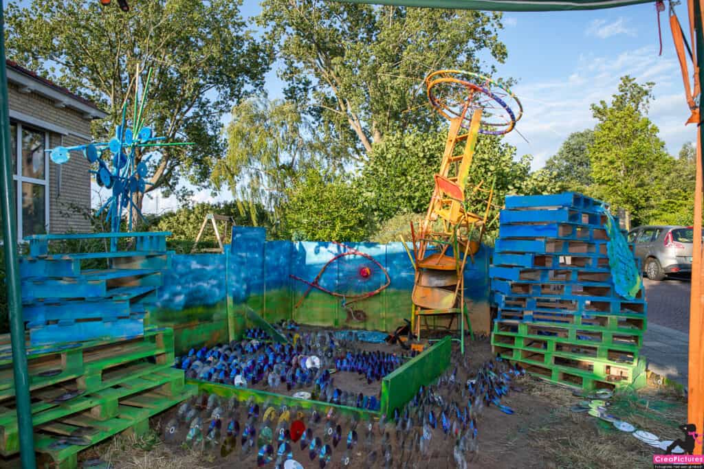 15 juli 2023 | Onthulling van een bijzonder, verbindend kunstproject bij arbeidstrainingscentrum Thorbecke | Twijn | TalentStad in Bedrijf (TIB) in de Zwolse wijk Pierik begin juli. Daar presenteerden kunstenaars, jongeren uit de wijk en scholieren feestelijk hun SLAKKENHUIS: beeldende kunst van grote objecten, kleuren en materialen aan de hand van het thema ‘Thuis’. De benodigdheden waren voor een groot deel verzameld door Kringloop Zwolle en gedemonteerd door de leerlingen van TIB.