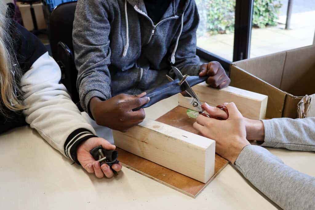 ‘Het is niet moeilijk,’ zegt Mo terwijl hij een band over twee plankjes spant, ‘maar het moet wel veilig. Als het goed gaat, gaat het goed. Als het fout gaat, gaat het fout.’ Delano knipt de aangespannen fietsband in tweeën en knikt instemmend. ‘We moeten het nog uitvinden. In het begin probeerden we het met een gewone schaar. Dat wilde niet. En toen kregen we een nieuwe schaar. Dat ging veel beter. Wij hebben al heel veel fietsbanden geknipt. En we vinden het heel leuk werk.’ Collega Dyanne kijkt mee. ‘Ik wil dit ook wel gaan doen. Het knippen lijkt me leuk. En ik vind het mooi dat het opnieuw gebruikt kan worden.’