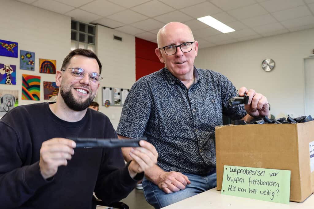 14 oktober 2025 | Bij dagbestedingslocatie de Golfslag van Frion in Zwolle ruikt het naar rubber. ‘Het is echt belangrijk en zinvol werk wat jullie doen,’ zegt circulair ondernemer Hermen Fikse van Roestug tegen Mahamed, (hierna genoemd Mo) Delano en Dyanne. Zij werken op de Industriegroep en verwijderen ventielen en plakkers uit oude fietsbinnenbanden. Zo maken ze van afval nieuwe kansen. Partners van circulair ambachtsnetwerk Roestug, Circular Rubber Platform, VSO de Ambelt, arbeidstrainingscentrum TIB, Atelier van Middendorp, ROVA en Stichting Kringloop Zwolle én Frion, Golfslag industrie, geven met het project oude binnenbanden een tweede leven.