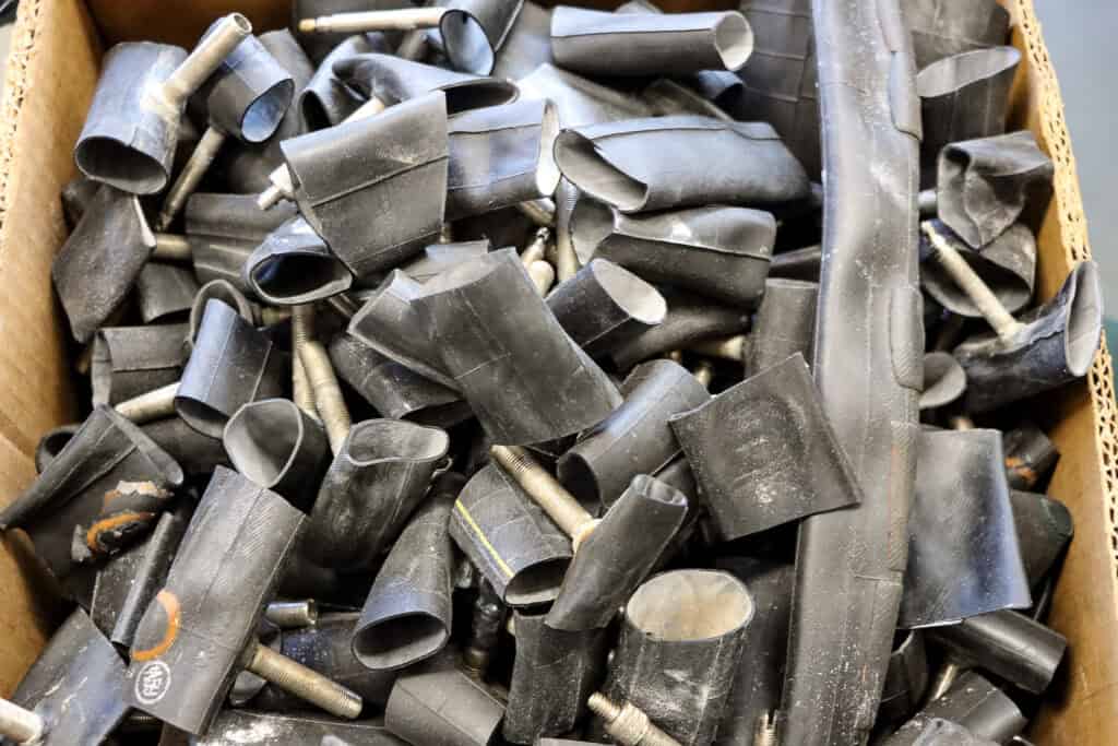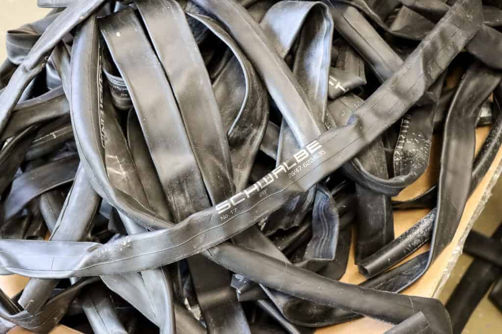 ‘Binnenbanden, buiten het metaal, kunnen prima gerecycled worden, ontdekten we door onze samenwerking met Circular Rubber Platform. Toen is het balletje gaan rollen,’ vertelt Hermen. Roestug recyclet onder andere fietsen. ‘Het blijkt dat je een flinke hoeveelheid nodig hebt om het voor de recyclers interessant te maken. Dus besloten we meteen te gaan inzamelen en de keten te gaan vormen. WaardeRing speelt bij ontwikkeling en begeleiding een essentiële rol.’ Het is echt een pilotproject. ‘De knipmethode moet goed staan, evenals de logistiek. Ook zoeken we uit hoe we de fietsenmakers beter en meer kunnen betrekken. Financieel is het ook lastig, want het levert niets op. Voor 2000 kilo zuiver rubber krijg je zo’n 400, 500 euro, terwijl je daar enorm veel werk voor moet verzetten: we halen nu per maand zo’n 150 kilo op. Voorlopig is de grote winst het milieu. En zo zijn er allemaal vraagstukken die uitgezocht moeten worden. Dat doen we met z’n allen, we werken heel fijn samen. Waar dergelijke projecten vaak bij voorbaat al stranden omdat ze niet rendabel of te moeilijk zijn, zijn de WaardeRing-partners niet te beroerd om het gewoon te gaan proberen.’ Met de Circulaire Ketensubsidie van RVO kan de keten goed neergezet worden qua logistiek, onderzoek en veiligheid.