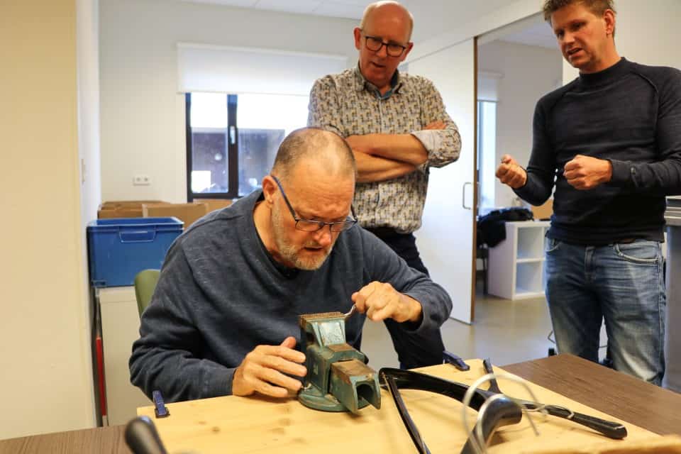 Hilco demonstreert het systeem dat hij bedacht heeft om de metalen haken van plastic kleerhangers te verwijderen. Op een houten plaat heeft hij een bankschroef gemonteerd. ‘Daarin klem ik de kleerhanger. En dan kan ik zo de haak eraf buigen’, legt hij uit. ‘Er blijft alleen een klein plastic ringetje om de haak zitten. Dat moet er ook nog af.’ Hij peinst en loopt naar de schuur. Even later komt hij terug met een nijptang. Die klemt hij in de bankschroef zodat hij goed kracht kan zetten op de haak: het plastic ringetje geeft het op. Edith de Lange is trots op hem. Ze is persoonlijk ondersteuner werk op de industriegroep van de Golfslag. ‘Hilco bedenkt overal slimme oplossingen voor’, vertelt ze.
