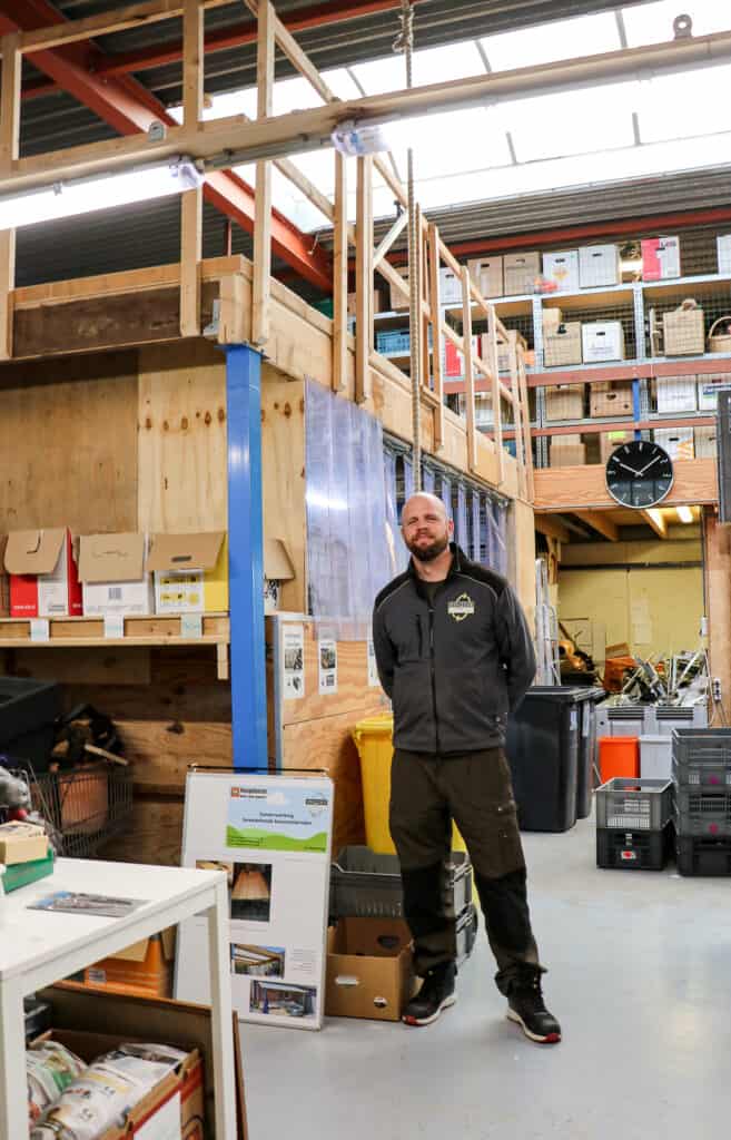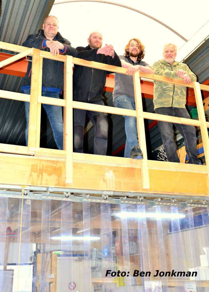 ‘Het houten geraamte komt van circulair sloopbedrijf Hoogeboom in Raalte‘, vertelt bedrijfsleider Robin Drost. ‘Je kunt er op staan. Het houten plaatwerk en de reling komt uit een oude hal. En de stalen staanders vonden we hier een paar jaar geleden in de oudijzercontainer. Het strokengordijn had Kringloop Zwolle nog over.’ Hij is trots op de mannen die het voor mekaar hebben gebokst. ‘Ze hebben de stalen staanders ingekort, weer in mekaar gelast en op betonblokken geplaatst. Het is allemaal hartstikke stevig en volkomen arboproof. Eén van hen werkte vroeger in de bouw en weet precies hoe het moet. En dat alles ook nog eens duurzaam en circulair. Hoe mooi wil je het hebben?’ Noggus&Noggus kan er weer tegenaan deze winter.