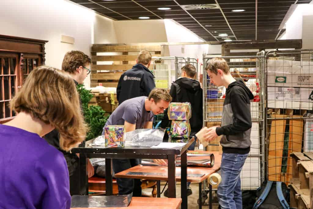 Kerstballen sieren de wand achter de kassa. In een mooi oud kabinet prijken kerstcadeautjes. In een hoek naast de deur maken studenten een photobooth, voor klanten die een leuke kerstkiek willen maken. Student Sjoukje is druk met kerstpakpapier in de weer. ‘Duurzaamheid en circulariteit is belangrijk in ons toekomstige vak. Steeds meer opdrachtgevers willen het.’ Het vergt een andere benadering. ‘Je maakt wel nieuwe dingen, maar gaat daarbij meer uit van oude materialen en oude producten, zoals hier. Je leert als het ware andersom denken.’