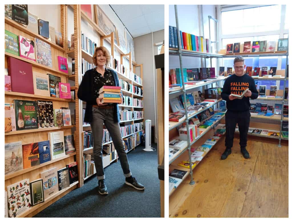 Afbeelding: Gerlinde houdt zich bij Noggus & Noggus Hasselt voornamelijk bezig met kleding maar is nu ook druk bezig met de voorbereidingen voor de kinderboekenruilbeurs. Thijmen van Noggus & Noggus Ommen is in opleiding bij Noggus & Noggus Ommen in een leer-werktraject. Hij gaat in drie jaar alles leren over inname, magazijn en afvalstromen en is nu druk bezig met de voorbereidingen van de kinderboekenruilbeurs.