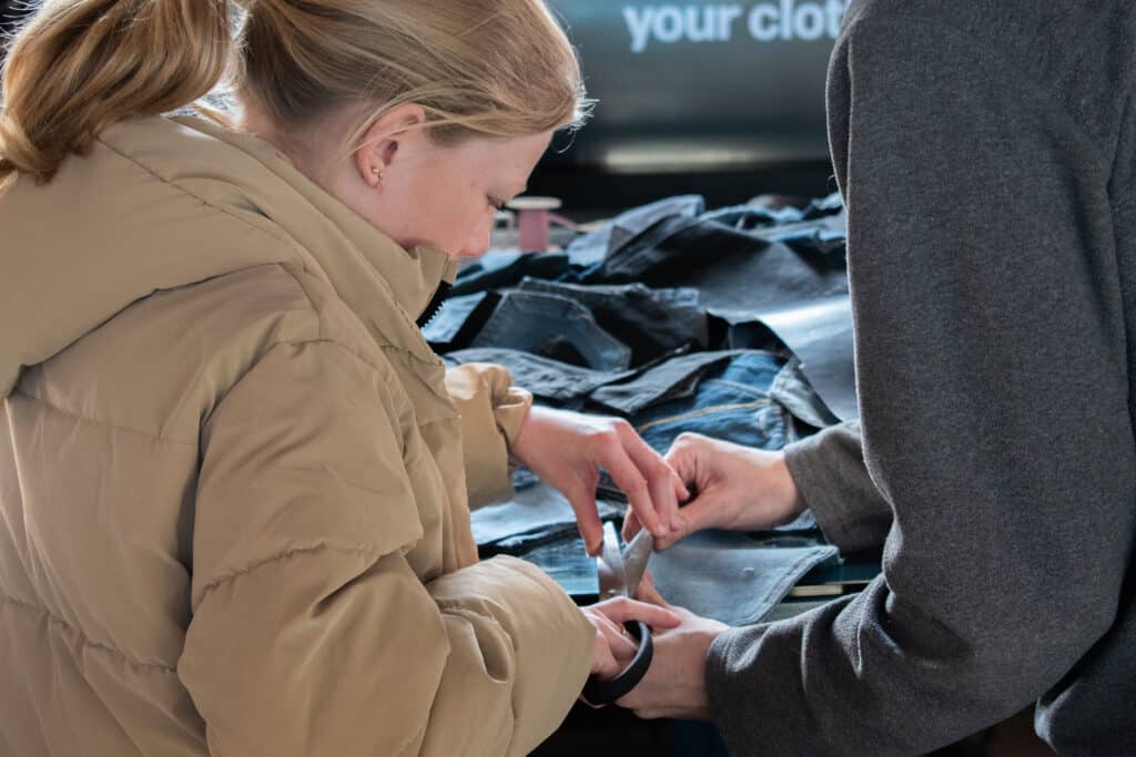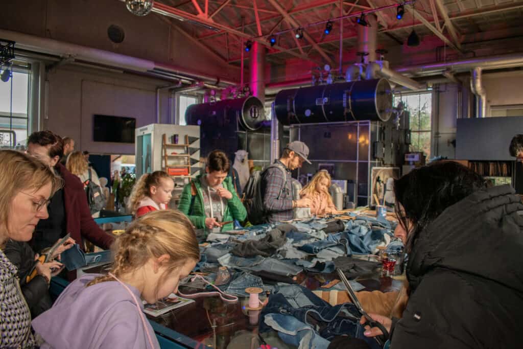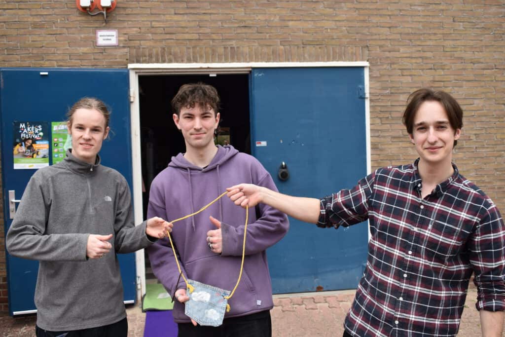 Al in september werden Cibap studenten voor de uitdaging gezet om een workshop met tweedehands materialen voor het Makersfestival te ontwikkelen Hier lees je meer over in dit artikel. Winnaar van deze opdracht was het ontwerp “REWORN” van studenten Jari, Fabian en Nathan. Zij ontwikkelden een workshop waarmee deelnemers een tasje maken van de achterzak van een spijkerbroek. Leerlingen van TIB werden ingeschakeld om de spijkerbroeken, afkomstig van Stichting Kringloop Zwolle, op maat te knippen. Door al deze inspanningen stond er op het Makersfestival een gave workshop klaar. De hele dag lang waren kinderen druk aan het knippen, knopen en schilderen. David en Tycho, twee jonge bezoekers, zijn geïnspireerd: “Met tweedehands materialen werken, dat is goed voor de natuur. Dat vind ik heel fijn. Thuis doe ik dat nog niet zo veel.”