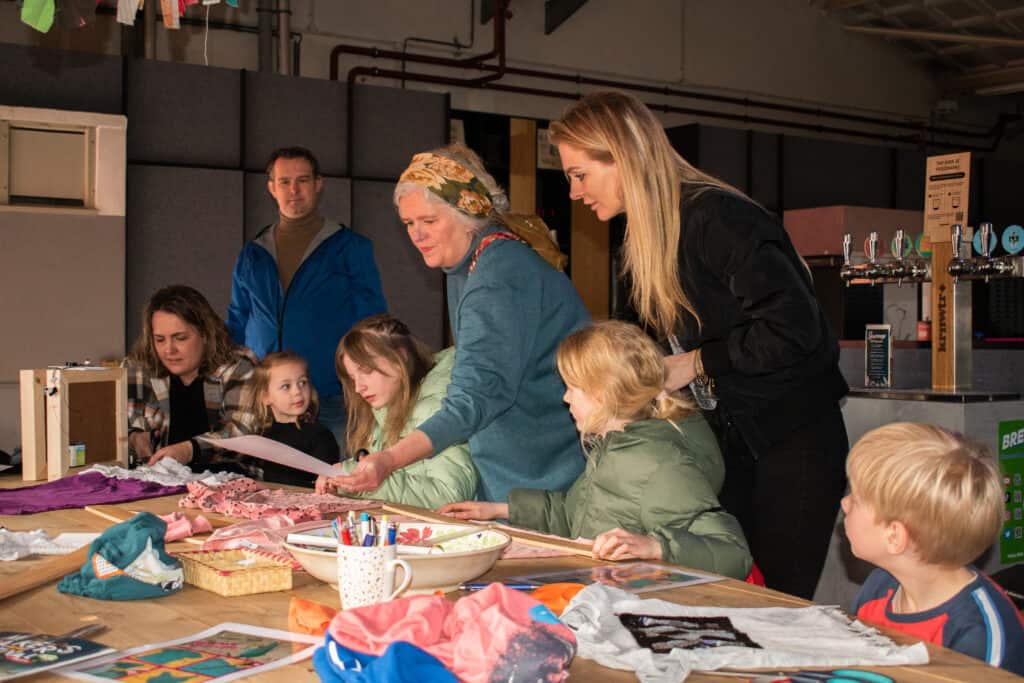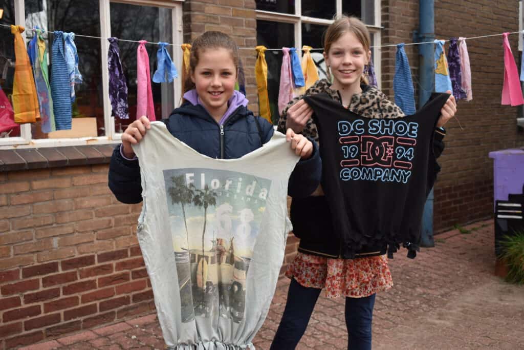 Één tafel verderop kunnen bezoekers tasjes maken van een oud T-shirt, onder de bezielende leiding van de vrijwilligers van atelier Stiksels van stichting Kringloop Zwolle. Bernardien Brinkhuis van het naaiatelier is blij met hoe het loopt: “Het is gezellig druk, we hebben inmiddels ongeveer 70 workshops gegeven. De workshop is niet te moeilijk en de activiteit duurt niet te lang. Da’s belangrijk.” Ook bij deze workshop worden alleen tweedehands materialen gebruikt. Zelfs het aftekenen gaat langs een oude bedlat, in plaats van met een nieuw gekochte liniaal. Bernardien: “Het is mooi dat we met de restanten van de kringloop werken. Bij de kringloopwinkel keuren we ook best wel wat T-shirts af. Deze gaan niet in de verkoop. Dan zijn ze bijvoorbeeld te pillig. Met deze workshop krijgen ze een mooie nieuwe bestemming.”