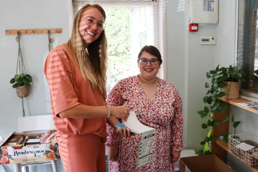 Hannelore werkt inmiddels twee jaar bij Paperclip. ‘Het inpakken van pakketten vind ik het leukst. Ik hou ervan dat het netjes is, dat alles klopt, daar voel ik me verantwoordelijk voor. Het is hier heel anders dan bij andere dagbestedingslocaties waar ik werkte voor ik terug naar Zwolle verhuisde. De deelnemers krijgen niet allemaal dezelfde begeleiding. Dat kan ook niet, want alle mensen zijn verschillend. Ze kijken hier naar wat jij kan en wil. Dat vind ik wel heel fijn.’ Ook het werk bevalt haar. ‘Het is nuttig en ook duurzaam. We maken van oud papier nieuw papier. En van oude kinderboeken nieuwe notitieboekjes. Geweldig. Het geeft voldoening om iets moois te maken dat iemand anders gaat gebruiken.’