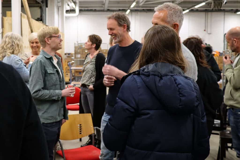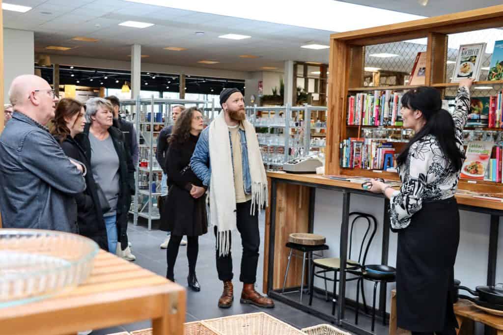 Projectleider Truus Doesburg van Kringloop Zwolle en Gerwin de Vries van Weever Circulair gaven een inspirerende rondleiding door het mooie nieuwe Kringloopwarenhuis. Hier lees je alles over deze nieuwe vestiging, waar het inmiddels storm loopt. En hier lees je welke WaardeRing-partners er allemaal aan mee hebben gewerkt. Na de rondleiding was het tijd voor een praatje en een drankje. Daar vloeien vast weer mooie projecten uit voort!