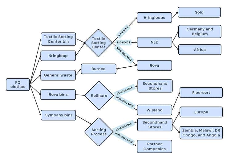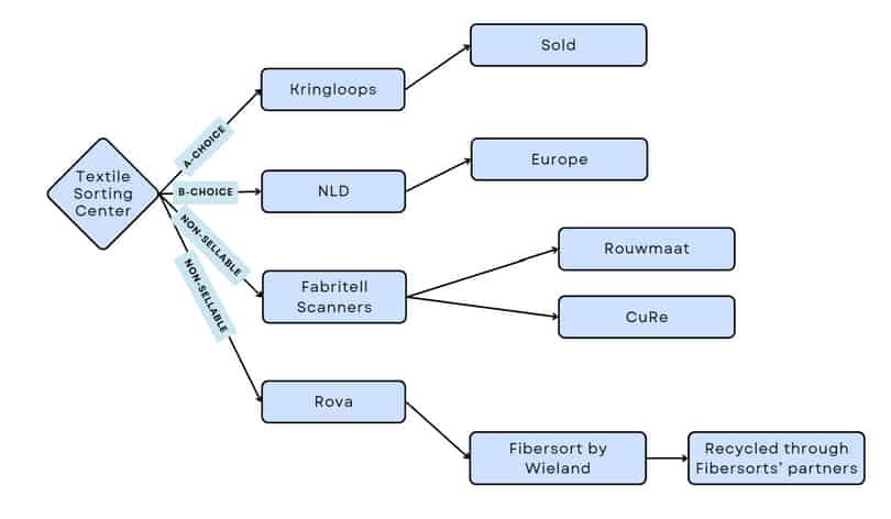 In een gedegen onderzoek ontdekten de studenten dat de kringloop contracten heeft die ervoor zorgen dat het aandeel dat niet in Nederland hergebruikt wordt (B-keuze) alleen naar Oost-Europa gaat, maar het blijft lastig om zicht op de keten te houden. Verder brachten de studenten scenario’s in kaart, waarin de doorstroming van polyester verbeterd kan worden. Hierop staan samenwerkingsverbanden met Nederlandse en buitenlandse bedrijven, die voorop lopen op het gebied van polyester sorteer- en recyclingtechnologie, zie hieronder.