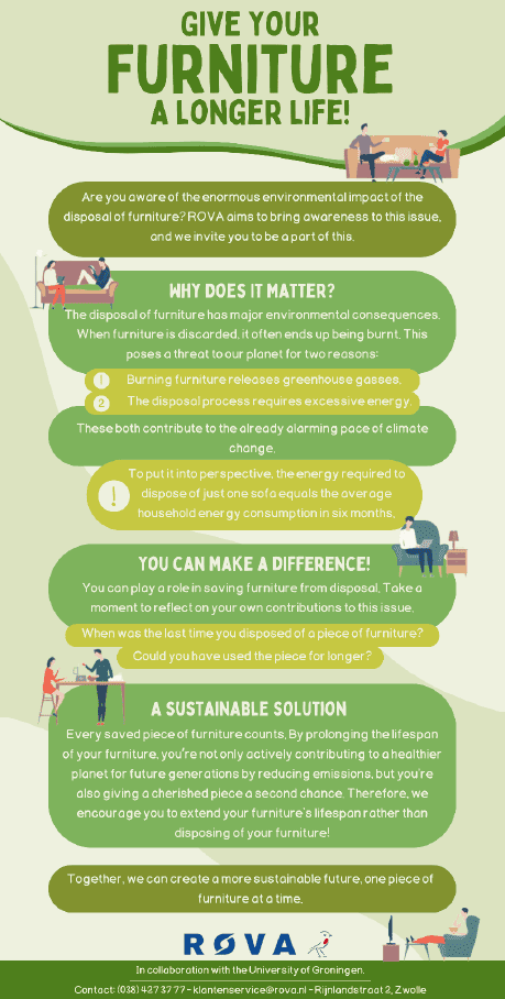 27 maart 2024 | Met een informatiecampagne consumenten bewust maken van de gevolgen voor het milieu als bruikbare meubels weggegooid worden. Dat is het advies van studenten van de Rijksunverisiteit Groningen die in opdracht van ROVA onderzoek deden naar levensduurverlenging van meubelen. De onderzoeksvraag kwam voort uit de grote hoeveelheid meubels die als afval op de milieustraat gebracht worden. Het onderzoek is onderdeel van het onderzoeksproject Urban Upcycling waaraan WaardeRing deelneemt.