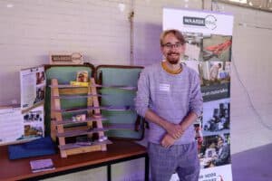 Stagiair Martijn met het product van zijn Ontwerpopdracht: een WaardeRing-koffer