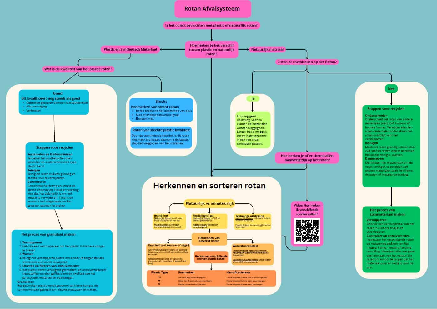 Om producenten te stimuleren hier beter over na te denken en sneller duidelijk te maken om welk product het gaat, hebben de studenten een advies voor organisatiebeleid ontwikkeld om te voorkomen dat het materiaal verloren gaat aan het einde van de levenscyclus. De boodschap: ‘Het invoeren van een duidelijk labelsysteem voor rotanmaterialen is een essentiële stap richting een duurzame toekomst. Het bevordert de recyclebaarheid en vermindert afval in de meubelindustrie.’ Ook hebben de studenten een handig boomdiagram gemaakt. Aan de hand hiervan zie je in één oogopslag wat er mogelijk is met verschillende soorten rieten producten. Zo kan sneller een passende oplossing worden gevonden voor het artikel dat je in handen hebt (Klik voor een pdf-versie – tekst gaat verder onder de afbeelding):