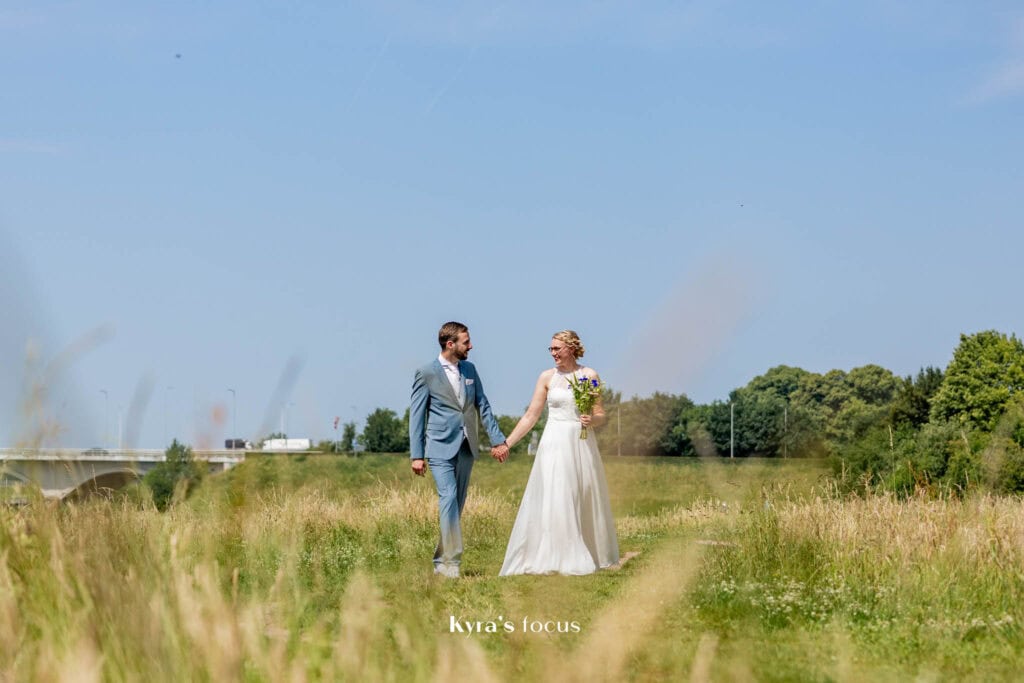 Het bruidsboeket kwam uit de pluktuin van biotuin Dijklandhoeve. ‘En toen ik een collega van mij de oorbellen beschreef die ik zocht, haalde zij een paar uit haar tas: ik mocht ze voor de gelegenheid gebruiken. De partytent heb ik geleend van scoutinggroep Indaba, waar ik een groep leid. Daar kon ik ook hoepels lenen waarvan we met stroken stof van onder andere Anne Marie een soort kroonluchters hebben gemaakt voor het feest ’s avonds. En de scouting stelde ook een partytent beschikbaar, plus biertafels waar we kleden van Kringloop Zwolle oplegden. We hadden zelf de dienbladen gemaakt, met gaten erin voor de glazen. En we hadden witte lampionnen: niet van Aliexpress zoals iedereen doet, maar we hadden ze gehuurd.’