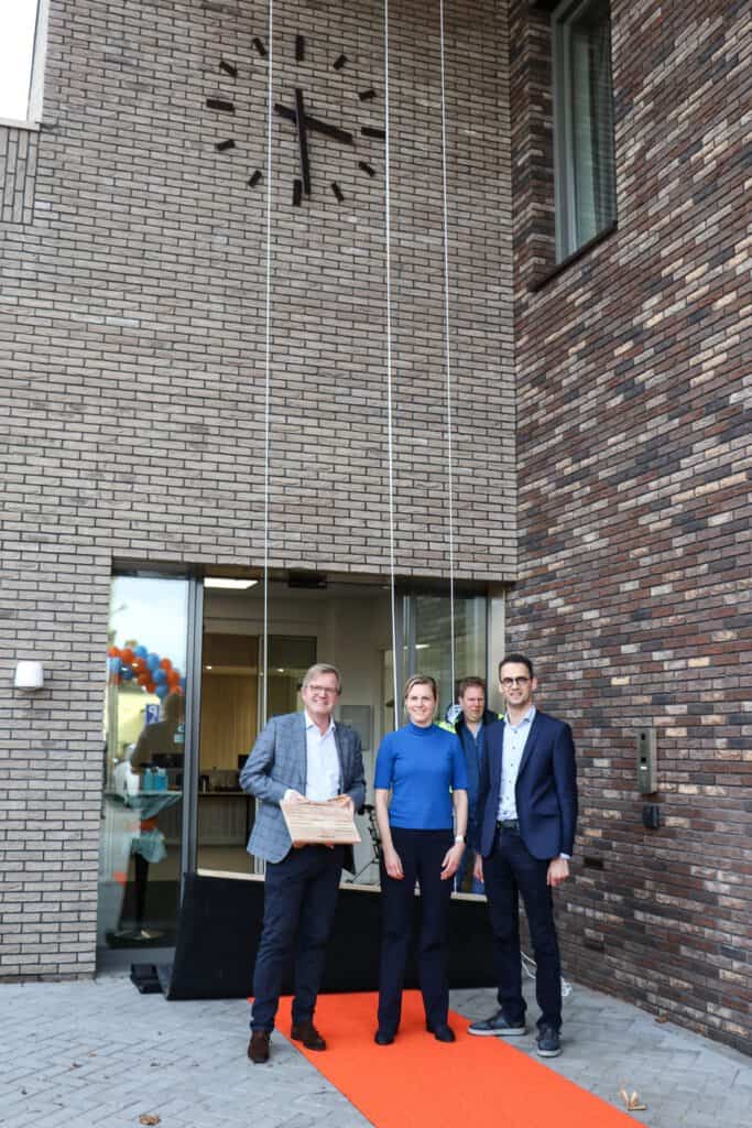 De opkomst was groot. Belangstellenden genoten van een door de cliënten verzorgd hapje en drankje en lieten zich rondleiden door het mooie, moderne gebouw. Wethouder Dorrit de Jong, voorzitter van de Raad van Bestuur van Frion Hugo Broekman en directeur Arjan Berends van Salverda Bouw onthulden een fraaie gevelklok boven de ingang. Het was een geschenk van de gehele bouwgroep en het kwam met een verhaal. ‘De cliënten hebben ons goed geholpen tijdens de bouw’, vertelde de directeur van Salverda Bouw. ‘Ze volgden alles op de voet, gaven aan wanneer het schafttijd was, maar vooral ook wanneer die schafttijd er weer opzat. Vandaar dit cadeau met de verwijzing naar tijd en dan met name schafttijd.’