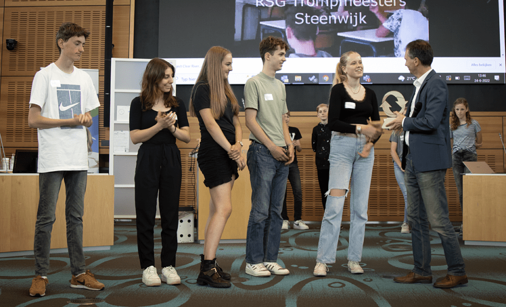 Tien jongerenadviesbureaus presenteerden eind juni tijdens het eindevenement van Adviseurs van de Toekomst hun adviezen over actuele vraagstukken rondom de Circulaire Economie. Dit deden ze onder begeleiding van echte opdrachtgevers zoals WaardeRing-partner ROVA, Twente Milieu en Clear Rivers. De jury beoordeelde de adviezen onder andere op haalbaarheid en creativiteit. Juryvoorzitter Van Hijum: ‘We hebben maar één aarde, met een beperkte hoeveelheid grondstoffen. We maken daar prachtige producten van, maar produceren tegelijkertijd heel veel afval. Daar moeten we vanaf. Het is fantastisch om te zien hoeveel leerlingen met ons mee willen denken over hoe we de wereld beter, mooier en schoner maken!’