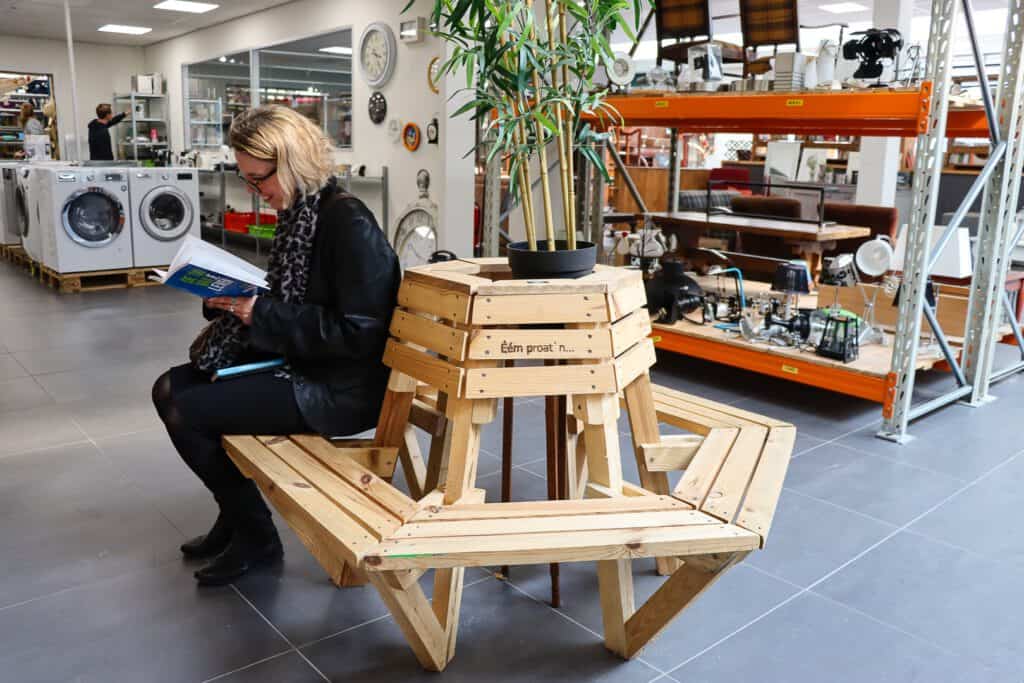 Aldaar leidde projectleider Truus Doesburg met verve de aanwezigen rond. Ze vertelde hoe de verbouwing circulair tot stand is gekomen en lichtte de verschillende afdelingen en hubs toe. Truus verstaat de kunst om de verhalen die tweedehands spullen en een circulair gebouw altijd bij zich dragen, ook daadwerkelijk op inspirerende manier te vertellen. Daardoor transformeert in de beeldvorming de boekenafdeling meteen in een bibliotheek, een gang met schilderijen in een museum en de muziekhoek in een vintage discotheek. Het bleek lastig om de groep mensen bij elkaar te houden in een warenhuis waar zoveel valt te ontdekken en te zien. Een goed teken!